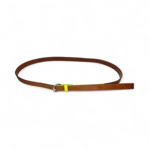 This Men's Paul Smith Jeans Brown Neon Green Two-tone Leather Belt in size 34 is a stylish accessory for dressy occasions. Made from high-quality leather with a metal hardware finish, this belt features a classic two-tone brown color that adds a touch of designer kitsch to any outfit. With an adjustable fit and a 3/8 inch width, this belt is perfect for men looking to elevate their style with a distinctive and fashionable accessory. Made in China, this belt is a versatile and trendy addition to any man's wardrobe.