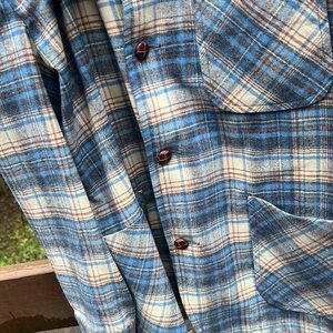 Up for sale is a great men’s size medium Pendleton checker plaid blazer jacket. Measurements are as follows. Armpit to armpit 21 inches color to bottom 30 inches shoulder to shoulder 18 inches. Very cool old vintage wooden buttons and great condition with no tears, rips or stains.