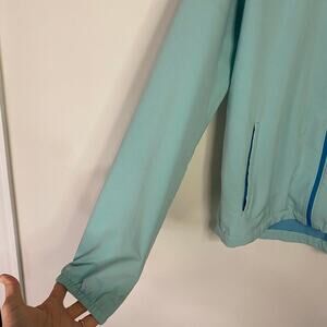 Mens Peter Millar Crown Sports teal full zip lightweight golf jacket. This lightweight jacket is perfect for Spring! The mock neck, full zip, cinched wrists make this great for any outing. On the inside there's a spot where the string has come out. I have shown it in the pictures. Otherwise in great condition!