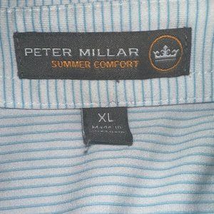 Men's Peter Millar Summer Comfort Blue/White Stripe Golf Polo Shirt Size XL. Made of 92% Polyester 8% Spandex. This shirt has a logo from Palmetto Dunes on one sleeve. This shirt is in excellent condition. There are no rips, tears, stains or damage. Ships from a Smoke Free Home. Any questions, please ask. All reasonable offers welcome.