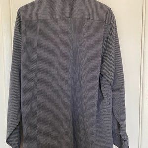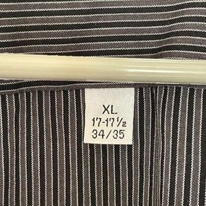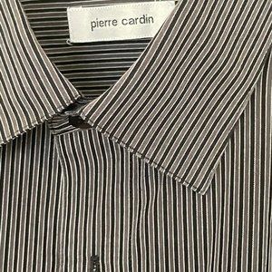 This is a men's black and gray Pierre Cardin striped dress shirt made of 60% cotton and 40% polyester. Its a men's size extra large with a 17-17.5" neck size and a 34/35" sleeve length. Its in EUC.
