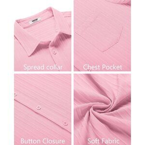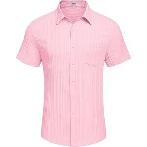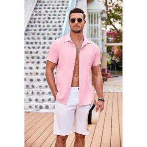 Men's Pink Casual Button Down Shirts Short Sleeve Textured Summer Beach Shirt