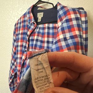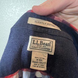 Medium, super soft plaid flannel. Broken in. Cool red/white/blue plaid pattern I've never seen anywhere else, or since from LL Bean. 100% Cotton