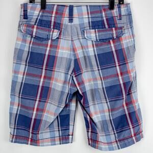 Old Navy men’s plaid chino shorts in red, white, and blue. Tagged 30, fit more like a 33 with a relaxed cut and long 12" inseam. Woven cotton with slash pockets, contrast stitching, and a low rise. Casual, easy-wear style with a bold Americana vibe. Light spot on front left leg (see photo)—priced accordingly.
