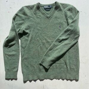 Men's Polo Ralph Lauren Sweatshirt Green Pony L V-Neck Wool Preppy Dad Classic. 100% Lambs Wool.