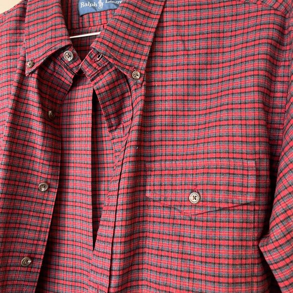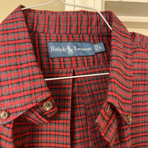 Men's size large buttondown. Has a pocket on left side of chest. Dark red/plum color with grayish blue and black fine stripes. Great condition, doesn't fit me so I never wore it.