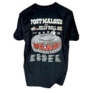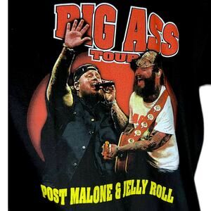 Get ready to rock with this awesome Post Malone & Jelly Roll Big Ass Tour T-Shirt! This black tee is a must-have for any fan of these incredible artists.