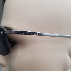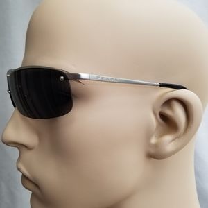 Men's "Prada" Sunglasses, Brushed Silver Frame, Dark Grey/Black Lenses, Signature Prada Logo On The Arm, Made In Japan.