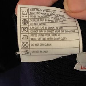 This sweater likes to collect all sorts of fuzz and hairs - I did my best to brush everything off. Also, there is a smaller stain on the bottom front - I suspect it that it will come off in the wash.