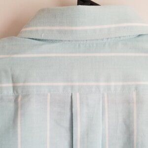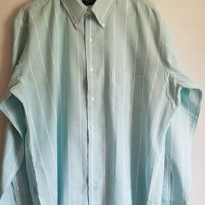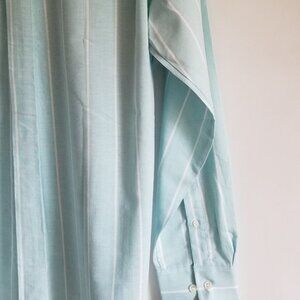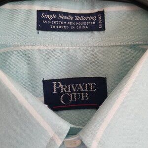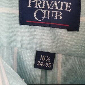 Men's Private Club single needle tailoring button down dress shirt fantastic shade of mint green with white stripes 55% cotton and 45% polyester size 16 1/2 - 34/35. Beautiful shirt, color and fabric. Measurements; pit to pit 25 inches, length 30 inches, sleeve length 25 inches. Pre owned excellent condition.