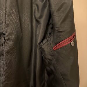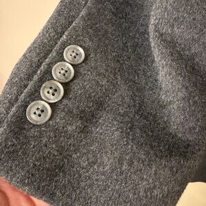 Elegant charcoal trench coat. Features button closure and sleek design. Ideal for formal and casual wear. Fully lined. Excellent condition with no rips or stains. Classic, professional, clean, classy. 42R translates to large. See measurements.