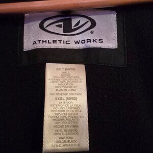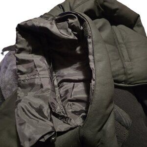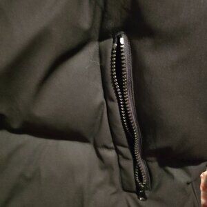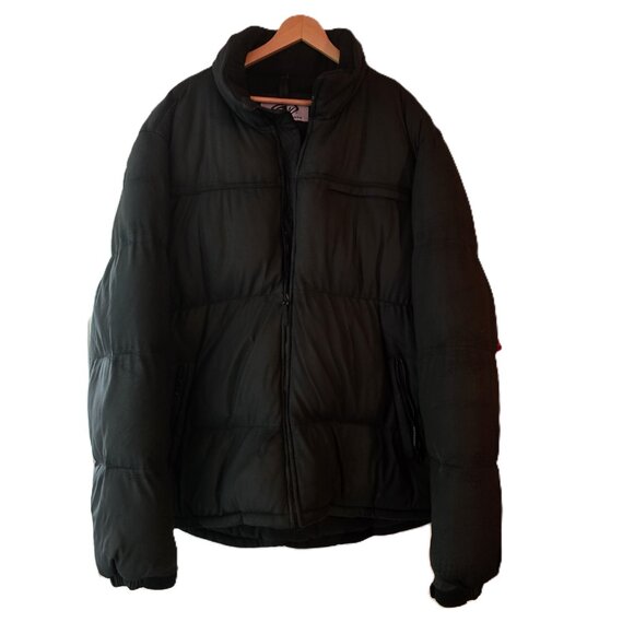 Men's heavyweight hidden hood in the collar insulated quilted puffer zip up jacket with side vents outer breast pocket two lower pockets. Black size 2XLT. Super warm. Worn once. Pet and smoke free home.