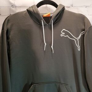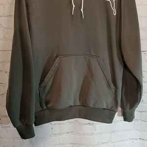 In very good used condition no flaws. Greenish grey in color. Pullover style with drawstring hood and kangaroo pocket