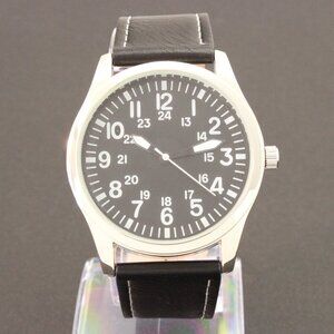 Men's Quartz Field Watch Silver Case Black Leather Strap 42mm