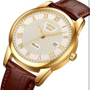Classic, analog watch, faux leather band, roman number time mark with the simplicity of business casual. Clean, round face with adjustable leather buckle strap.