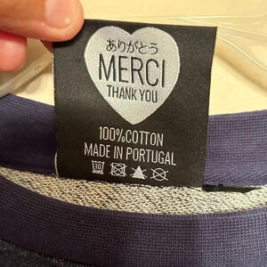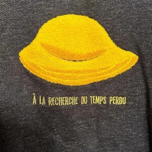 Organic cotton sweatshirt sold since 2018. Embroidered at the Super Atelier. In good condition, perfect for the fall and winter. Has some faint staining on the cuffs and the hem, but overall design is in great shape of a French Madeline and message underneath. Can be worn by men or women.