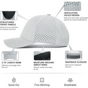Design: structured front panels, 6-panel cap, curved brim, laser-perforated side & rear panels for breathability, and soft touch snapback closure