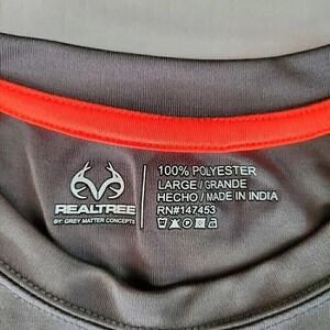 Men's Realtree silver gray athletic tee, size L large, with large camouflage and orange chest logo spellout. Shirt also features a small orange logo on the left sleeve. Color is accurate as shown in picture three, four, and five. This shirt is approximately 27.25" long and 21.5" from pit to pit. Material content is 100% polyester.