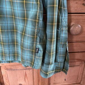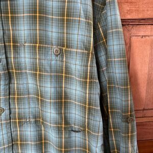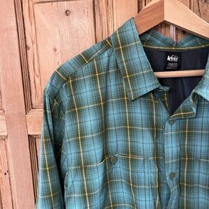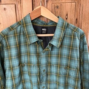 Men's REI Large Tall Shirt Button Up Green Yellow Plaid Collar Pouch Pockets