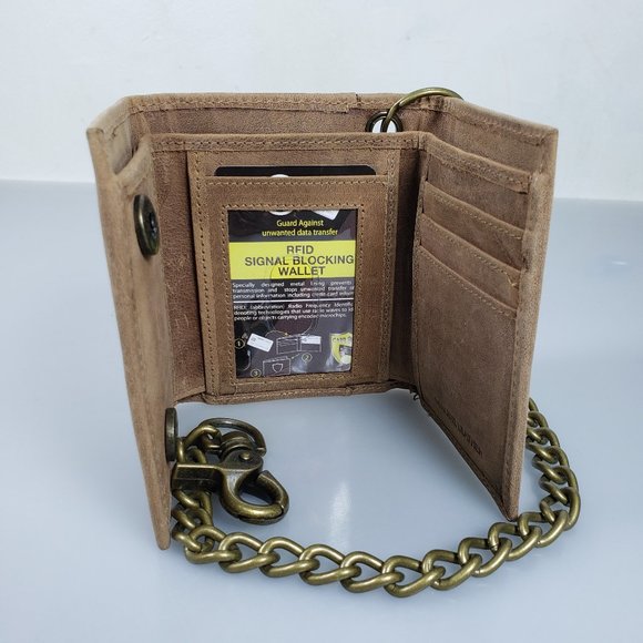 Signal blocking tri fold motorcycle chain wallet with vertical & horizontal cc pockets.