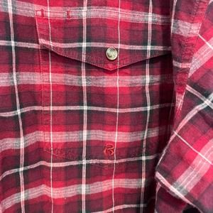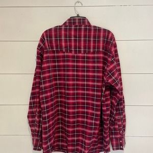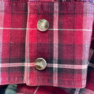 Gently preowned mens ROPER pearl snap black and red plaid long sleeve shirt size 2XL. This shirt is in very good condition except for one pearl snap is cracked on the right cuff shown in the photo but it is still operational.