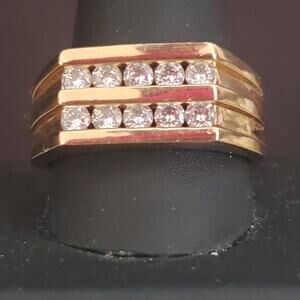 Men's Cigar Band ring made by RSC is gold tone and has two rows of CZ Stones. Size 12 in very good condition with minimal signs of wear.