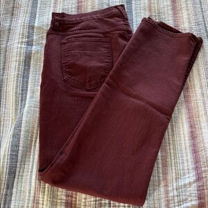 Sorta slim but not too slim fit and stretchy. Official color is oxblood.