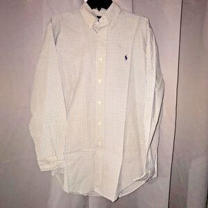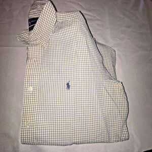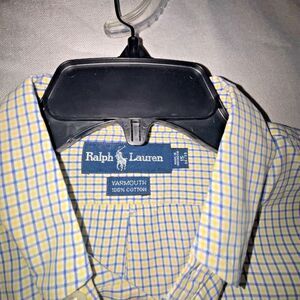 Men's Ralph Lauren Yarmouth 100% cotton long sleeve button up shirt. Pale yellow with nave checkered pattern with a navy embroidered polo man logo on chest. Size 15 with sleeves 32/33. In excellent preowned condition. Freshly dry-cleaned and ready for a new owner.