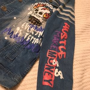 Denim jacket with studded and painted artwork by Rebel. Punk, hip hop, urban design. Pockets are still partially stitched (see pic). Practically brand new. See pics for measurements.