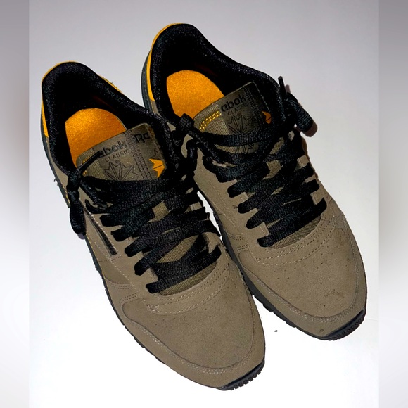 Men’s Reebok Classics in great condition. Worn only a couple of times. Olive green, yellow gold and black color. Size 8