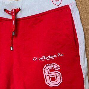 Mens ES Collection red shorts. These run very short about 5" inseam. They have been worn and washed, resulting in some fading of the red onto the number 6. Pockets on side and on in back.