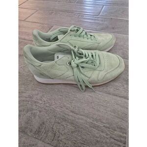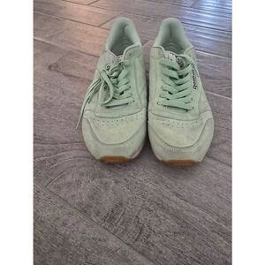 Reebok Classic Leather Pastel Aloe Green and Classic White. Good condition, with some minor signs of wear. Please carefully review photos. There are some "dirt" spots. Note - there are no insoles. Size 9.5.