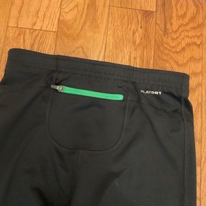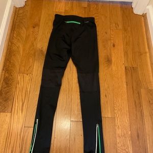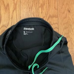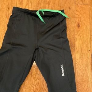 Men's Reebok Play Dry Black Running Pants, Size S. 88% polyester, 12% spandex. Elastic at waist with bright green drawstring. Small zippered pocket at center back. Reflective zippered openings at ankles. Made for a snug fit. Slim fit. Could also be used as a woman's.