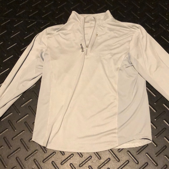 Light grey men’s Reebok pullover, size large. GUC. It looks like a heavy pullover but it’s pretty light weight.