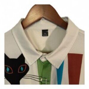 Color/Print: Light Beige base with multicolor geometric design & large black cat graphic (front & back)