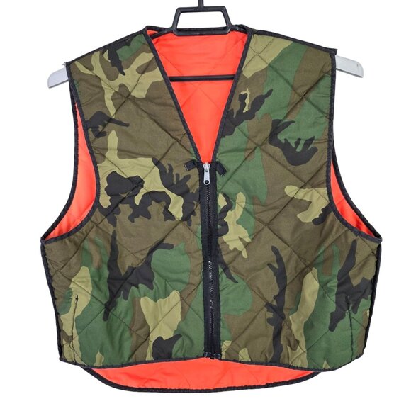 Designed for functionality and visibility, this reversible vest offers a camouflage pattern on one side and bright orange on the other, catering to outdoor enthusiasts and hunters. The quilted design ensures warmth, while the zipper closure provides ease of use.