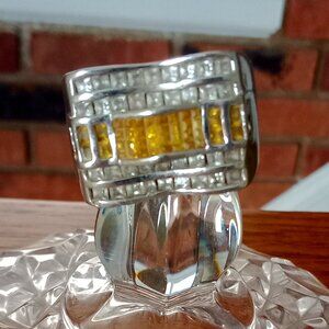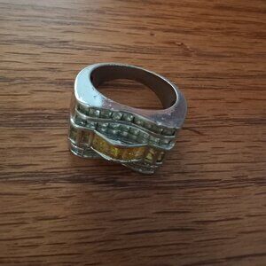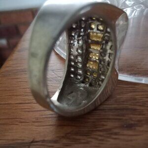 Men's Rustic...Gouged...Silver and Rhinestone Ring...front measures 5/8" high ... front center is inlaid with tiny yellow and clear rhinestones...size 12.5...13/16" inner diameter... marked "925"...pre-loved distressed condition ***see photos***