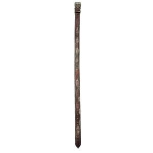 This Men's Rich Black & Merlot Colored Nocona Genuine Lizard Leather Belt in size 34 features a geometric diamond stitch pattern, adding a touch of Western flair to any outfit. The 1.5-inch belt is made from high-quality leather with nickel hardware accents, making it a stylish and durable accessory. The rich color and lizard material give it a unique and eye-catching appeal, perfect for those looking to elevate their wardrobe with a touch of Western style. Shows some signs of wear along the edge mostly just noticeable when viewed from angle of last pictures. Color most accurately shown in the second picture.