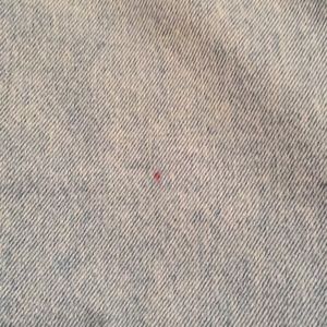 Zipper and button fly. A tiny red spot (barely noticeable) near the knee area.