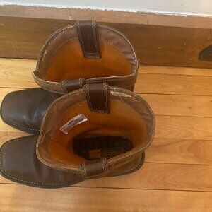 Men's Ridgecut YMN-2201 Waterproof Rancher Wellington Leather Boot, Size9M. The boot features a square toe shape, pull-on closure, and mid-calf shoe shaft style. It comes in a solid brown color, with a Western theme that is perfect for any occasion. The boot is made of leather, and man-made materials, with a waterproof feature that makes it suitable for all seasons. It has a foam insole material, and the outsole is also made of leather. The YMF-2201 model is perfect for Men who want to look stylish and feel comfortable, no matter what the weather. There are a few blemishes on the top of the inside of the boots. Item is in preowned condition. Please see photos for details as they are part of the description and any questions, just ask. You'll receive exactly what is pictured. There are a couple