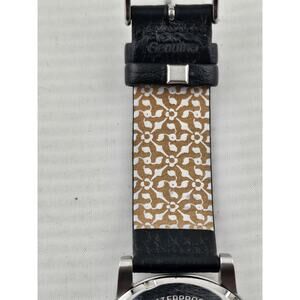 This watch is new and comes with a designer black leather band with art on the back and a dependable quartz movement. We have installed a new battery and tested it.And can verify it is keeping time accurately.