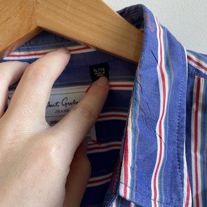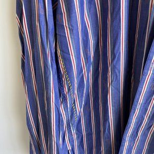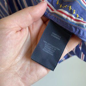 Color / Pattern: blue / white / red striped pattern, no additional pattern on sleeves, stitching detail.
