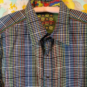 Mens Robert graham colorful plaid button down dress up shirt long sleeve xl. In great pre owned condition. No flaws. Beautiful and subtle colorful plaid design. Very well made. No flaws.