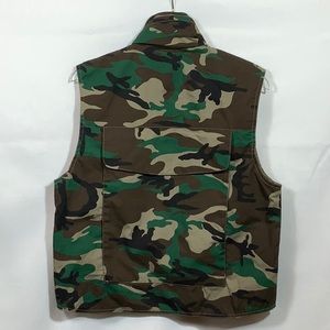 Cotton/Polyester material. 8 front hook and loop and zippered pockets. Rear hook and game bag in back of vest. Shell loops and a zippered collar with hood. Camouflage color. Khaki Interior. 60% Cotton, 40% Polyester.