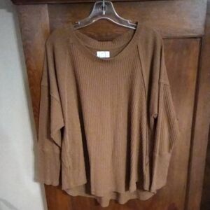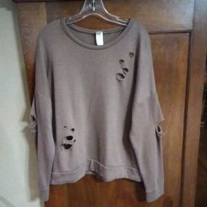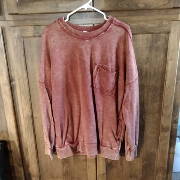 Stay cozy with this stylish rust distressed sweatshirt with front and side pockets, perfect for any casual outing.