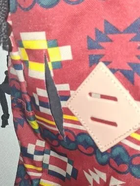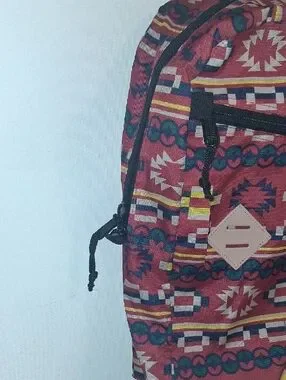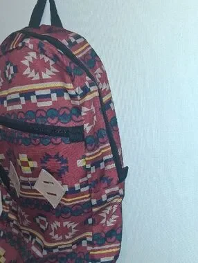 Bold rust-red backpack with colorful geometric print. Lightweight and practical for daily use. Front zip pocket and durable fabric for secure storage. Comfortable shoulder straps and easy top handle. Eye-catching rust-red design adds character to casual outfits.