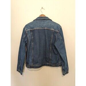 Tabs at back waist. Orange top stitching. Button flap chest pockets and hidden slash pockets at the lower front sides. Logo stamped metal buttons. Heavy 80s quality denim .