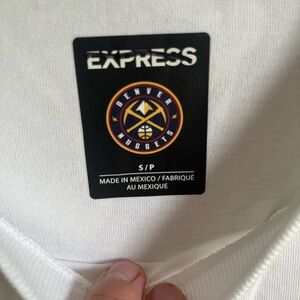 Mens White Express Denver Nuggets Graphic Print Short Sleeve T-Shirt - Size S Oversized - 100% Cotton - Has two small pink dots on the bottom of the shirt (can be seen in pictures) - No snags or discoloration - F27