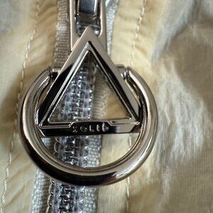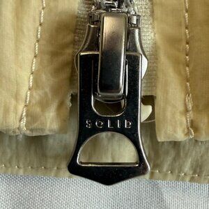 Features a two-tone beige colorblock design, full front zip, roomy zip pockets, and a packable, airy fabric—perfect for layering or travel