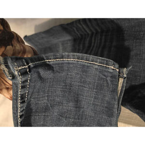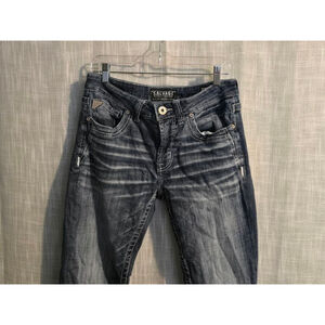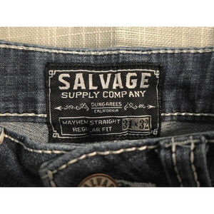 Pre-owned Salvage Supply Company Mayhem Straight jeans, size 31x32, in dark wash denim. Features include regular fit, contrast stitching, and minor fraying at the bottom hems where both hems have been cut about a half inch to a inch to make the ankle fit better. The jeans show signs of wear consistent with previous use.